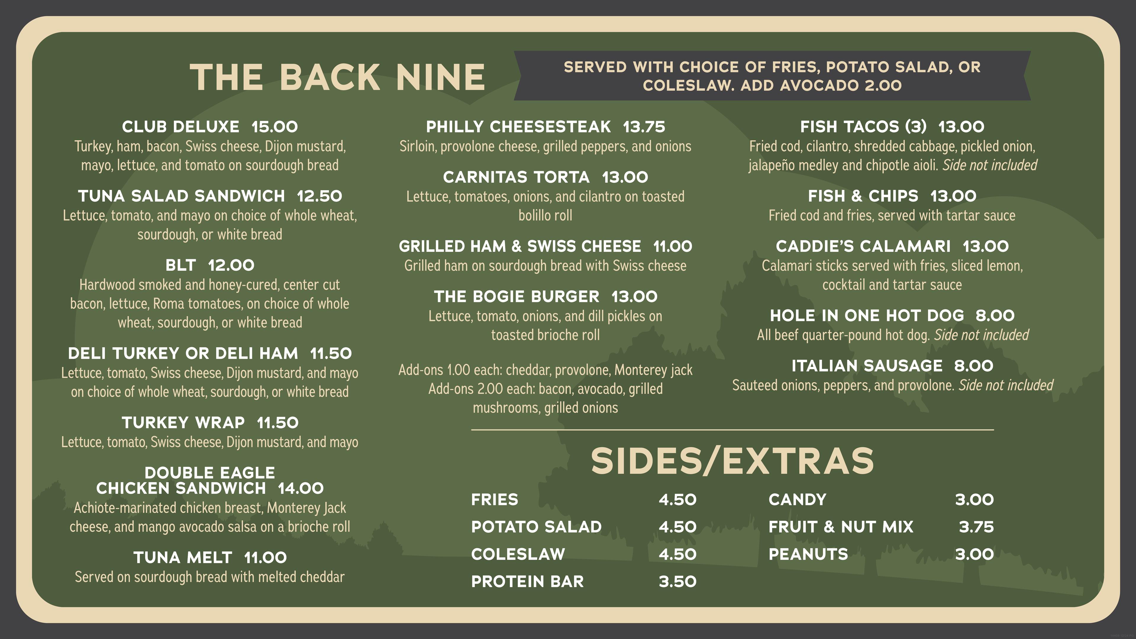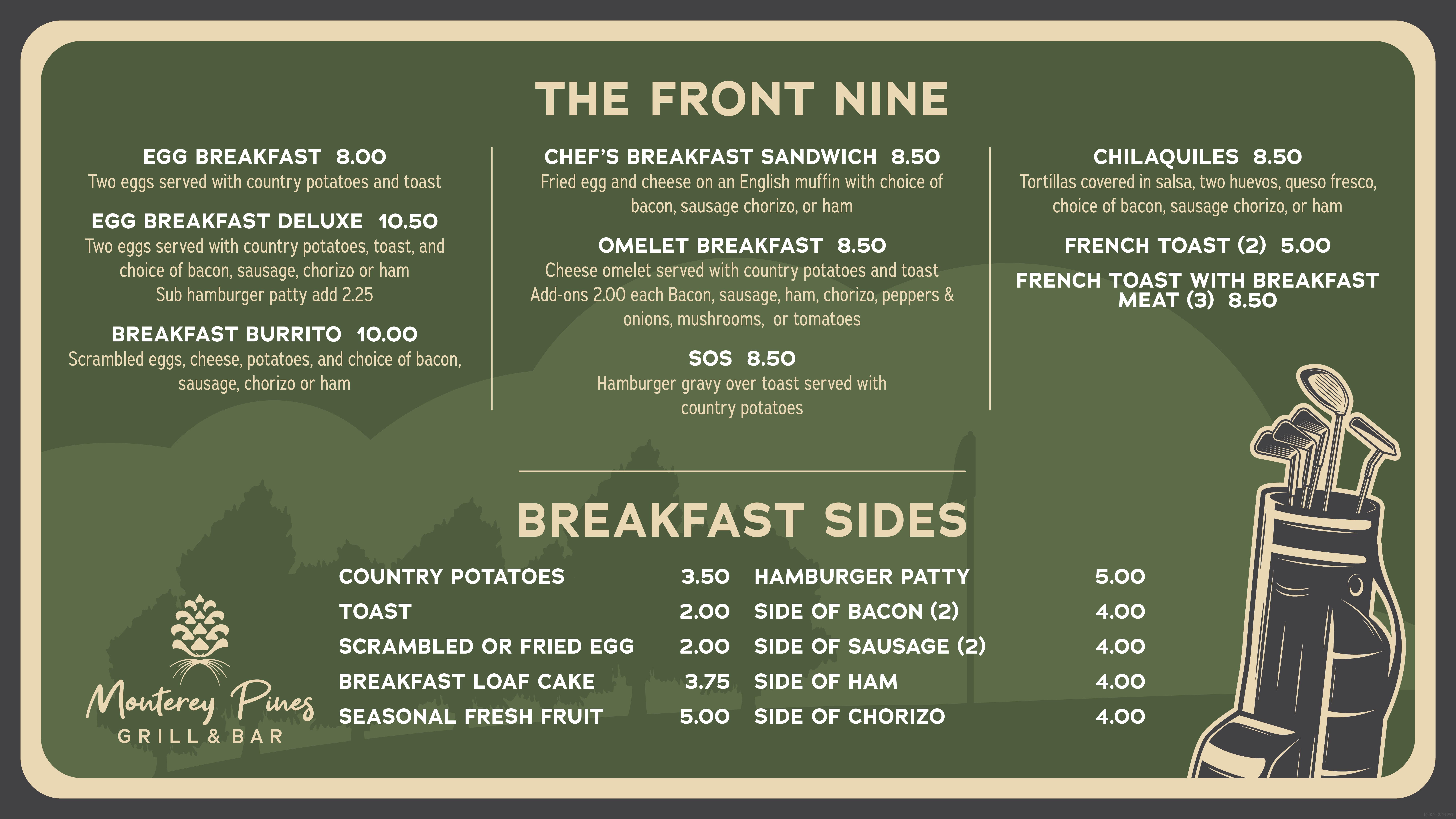 The Monterey Pines Grill & Bar offers an excellent selection of breakfast, or lunch items, appetizers and your favorite beverages. Our outdoor patio area has great views of the Monterey Pines Golf Club course and our bar area has televisions to watch your favorite sporting events after a round of golf. Located just a short 5 minute drive away from the Hotel Del Monte, the Monterey Pines Grill & Bar is an excellent choice for those who want to enjoy a nice view of the golf course while dining.